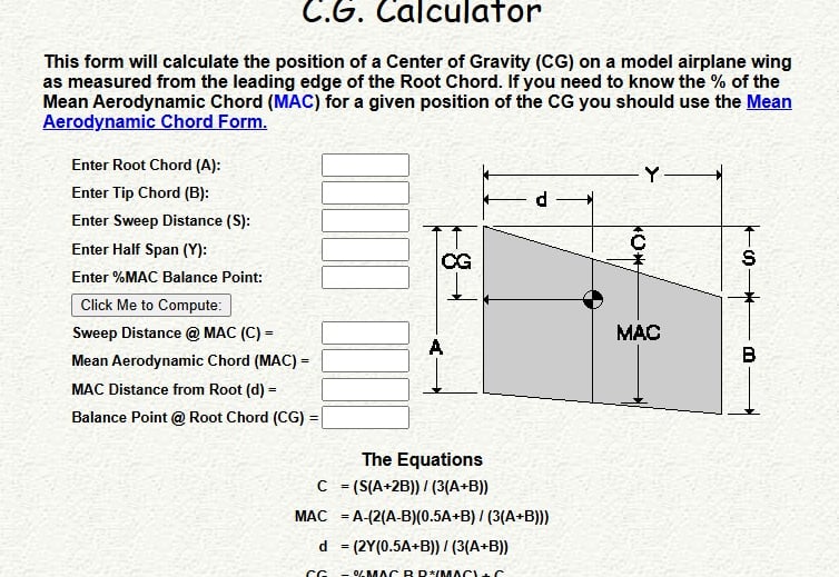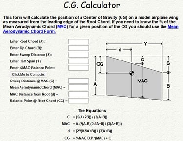 This form will calculate the position of a Center of Gravity (CG) on a model airplane wing as measured from the leading edge of the Root Chord. If you need to know the % of the Mean Aerodynamic Chord