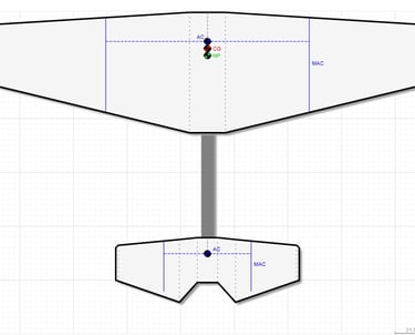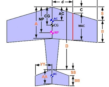 The cgCalc of eCalc.ch not only calculates and evaluates the center of gravity (CG), neutral point (NP) and mean aerodynamic chord (MAC) but also visualizes your design of conventional aircraft, flying wing, delta or canard. Approximate complex wing design with 5 trapezoidal wing panels. For further instructions see below..